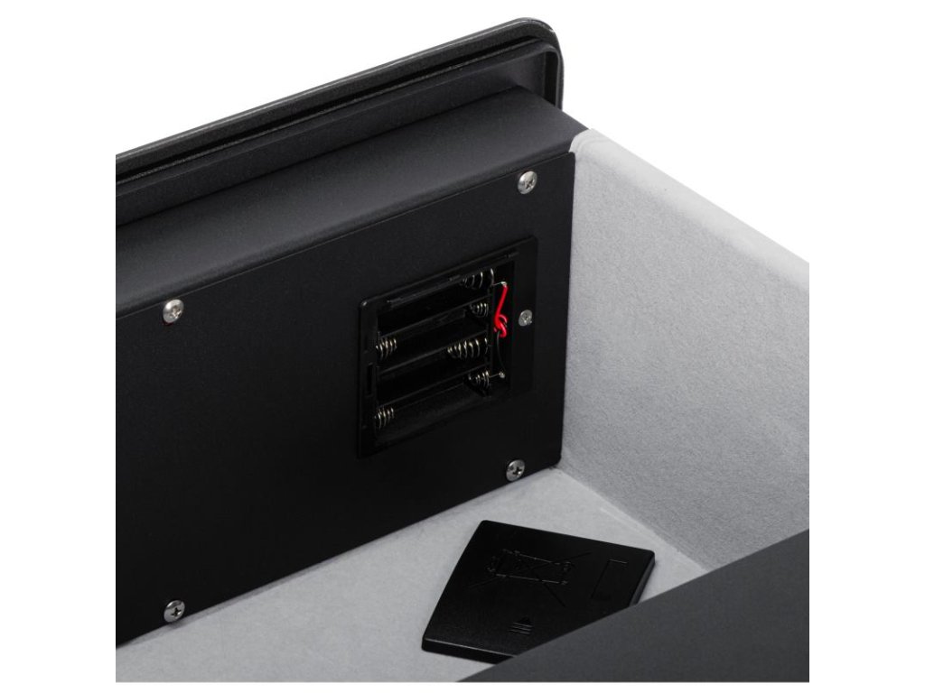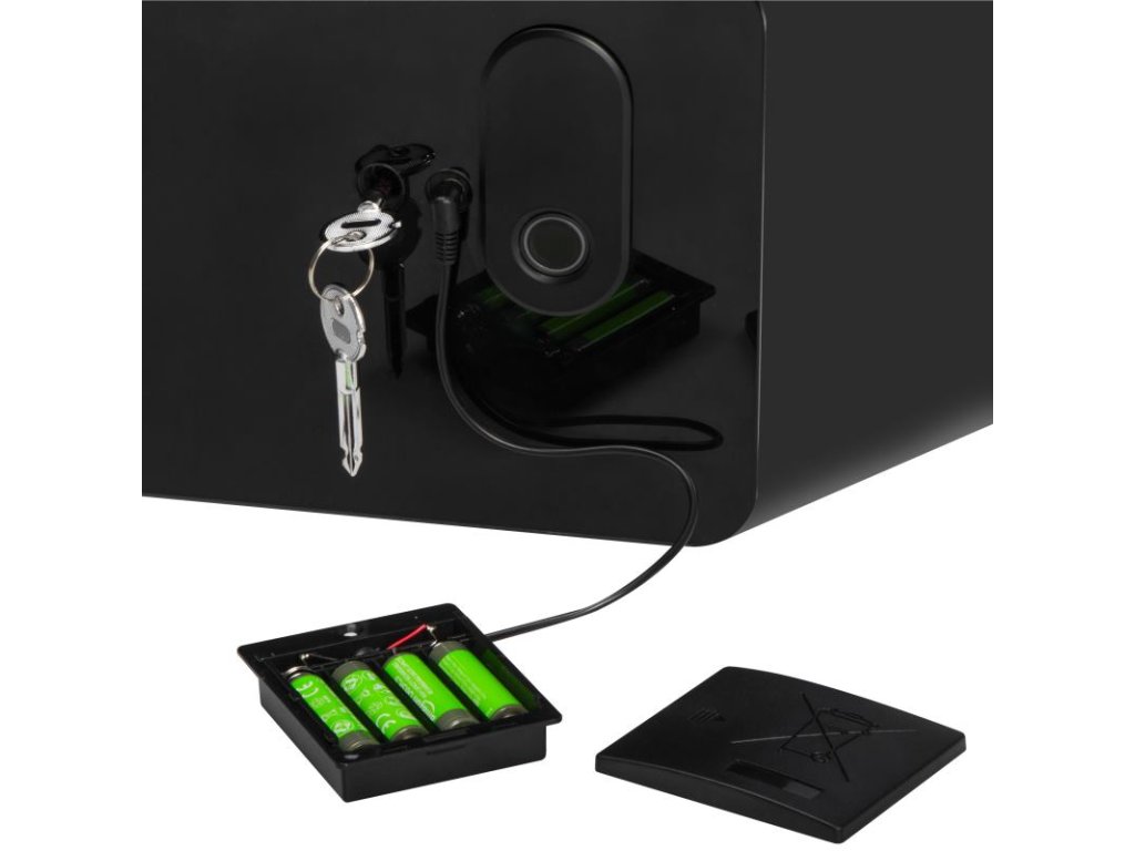 Núdzové otvorenie: V prípade vybitia batérií je možné trezor otvoriť pomocou externého napájacieho zdroja (je súčasťou balenia) alebo núdzového kľúča.