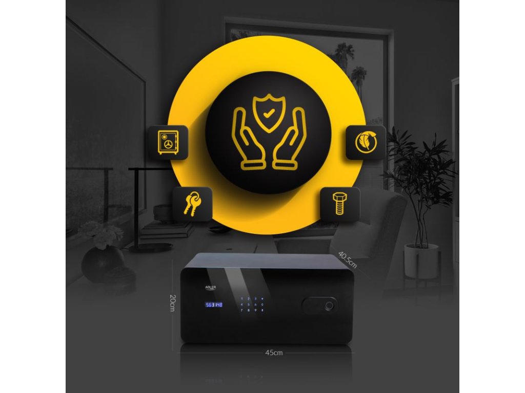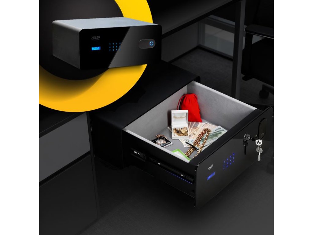 Chráňte svoje najcennejšie veci s moderným trezorom Adler AD 1044, ktorý spája vysokú úroveň zabezpečenia, odolnú konštrukciu a používateľsky prívetivú technológiu. Vďaka masívnym materiálom, dotykovému panelu a biometrickému prístupu si môžete byť istí, že vaše cennosti, dokumenty a osobné predmety budú vždy v bezpečí.