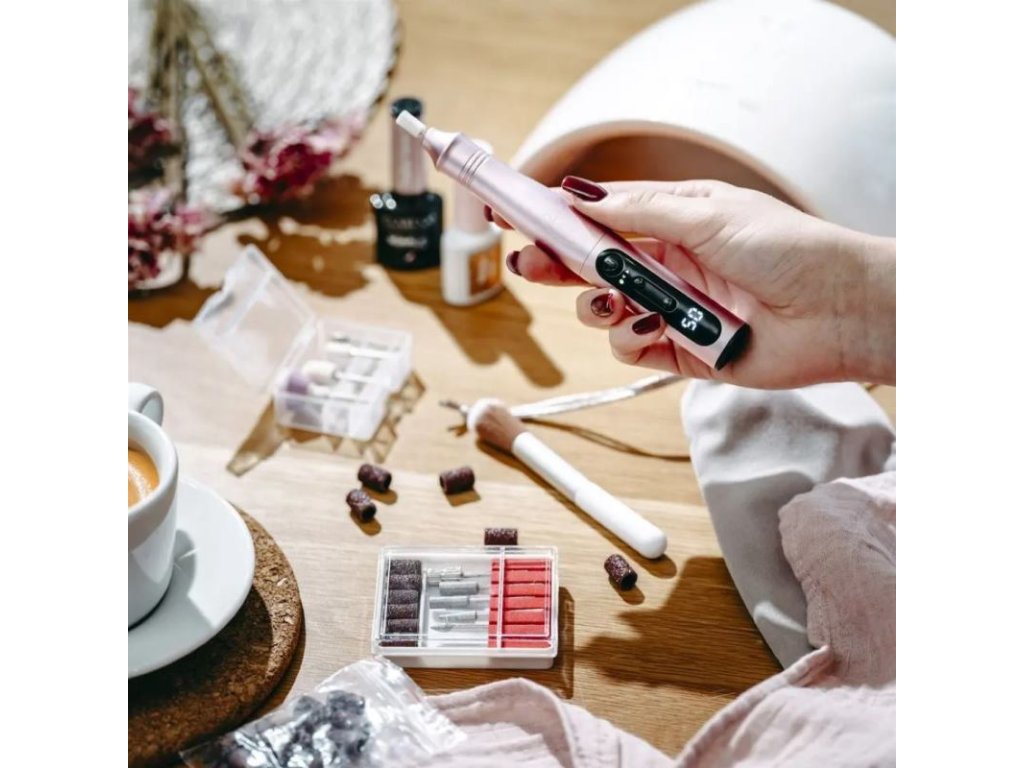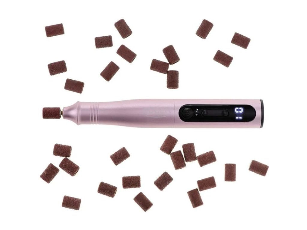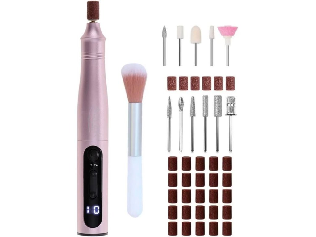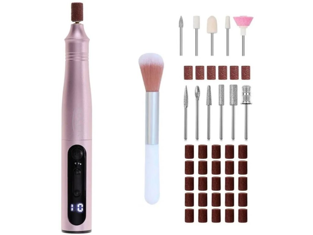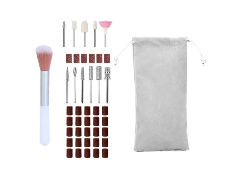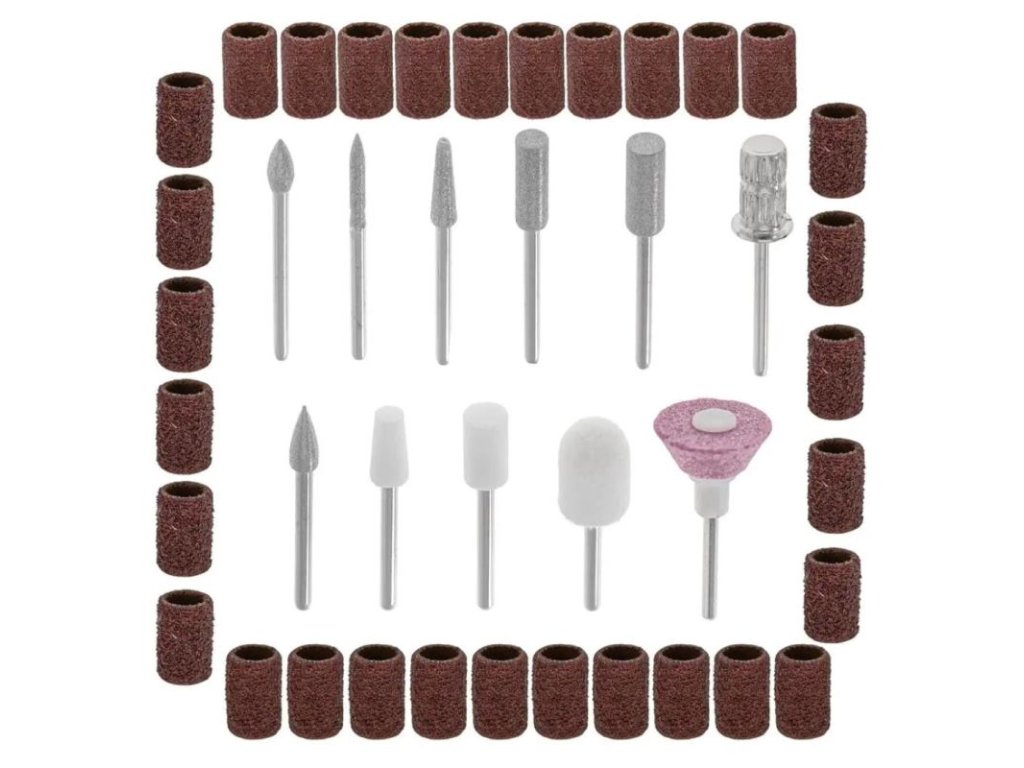 - Bohatá sada príslušenstva: Sada obsahuje 11 tvarovacích nadstavcov, 31 brúsnych pásov pre rôzne stupne starostlivosti o nechty, kefku na čistenie frézok a tašku na uloženie pre pohodlie a poriadok.