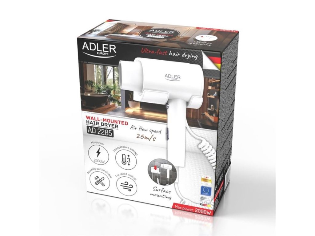 Zabezpečte svojim zákazníkom profesionálne a pohodlné schnutie vlasov v hotelových kúpeľniach a verejných zariadeniach s naším sušičom vlasov Adler AD 2285 biely. Tento moderný sušič je navrhnutý na montáž na stenu a kombinuje bezpečnosť, výkon a súčasný dizajn, čím sa stáva ideálnym riešením pre hotely, fitnescentrá a wellness strediská.