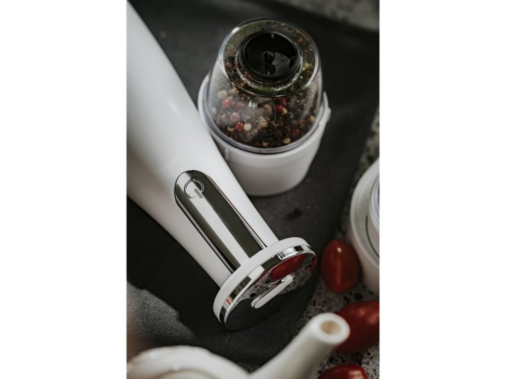 V cene: základňa, 3 vymeniteľné mlynčeky, zásobník, USB nabíjací kábel