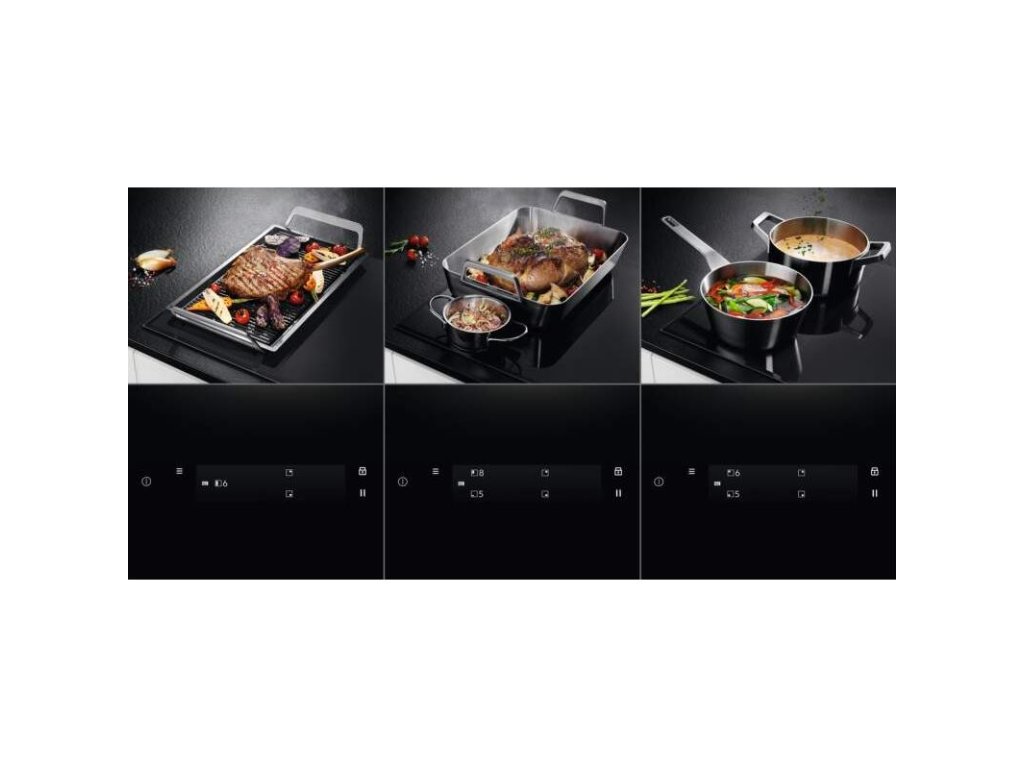 Ovládacie funkcie: 3 krokové využitie zvyškového tepla, akustický signál, rýchle ohriatie - funkcia Booster, detský zámok, časovač, Eco časovač, flexibilný Power Management, Hob2hood, zámok tlačítok, ľavý Bridge, rozmrazovanie, minútka, pauza, SenseCook Fry, vypnutie zvuku, ukazovateľ času