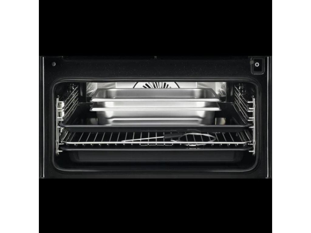 Výbava rúry - plechy: 1 smaltovaný koláčový plech na pečenie, 1 odkvapkávací pekáč sivý smalt, 1 sada s dierovaným pekáčom