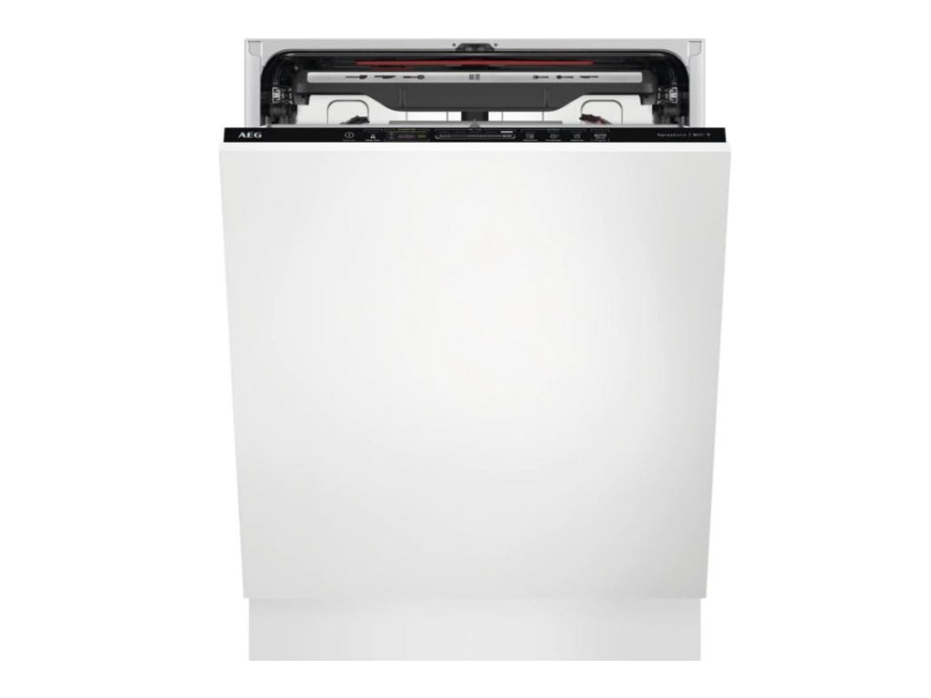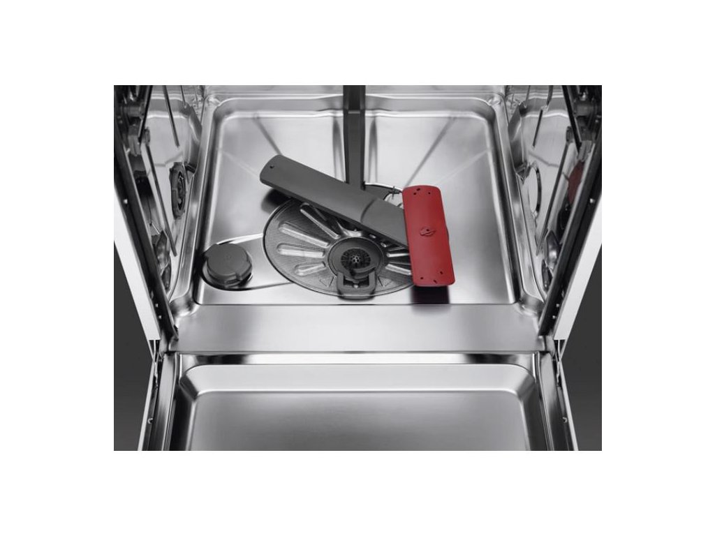 Horný košík s: 2 sklopné držiaky, 2 sklopné drôtené úchyty na poháre, 2 mäkké gumové špičky , 6 úchytov na poháre na víno, sklopné držiaky na poháre, Premium Rails, antikorová rukoväť AEG, postranné držiaky košíka