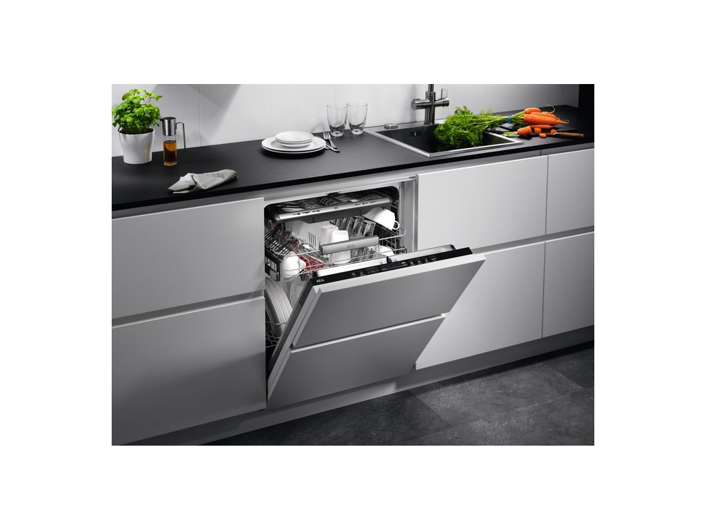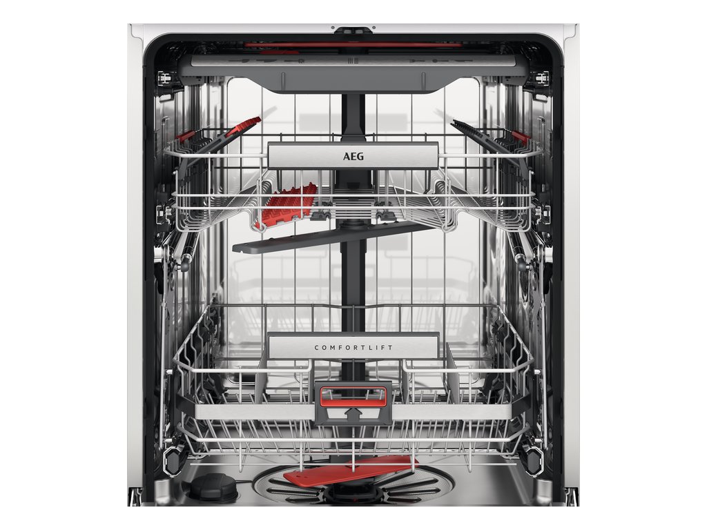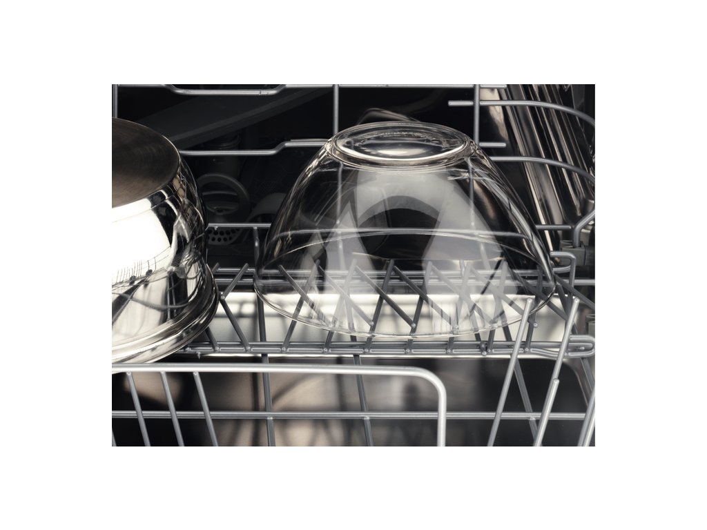 Vlastnosti horného koša: 2 sklopné držiaky, 2 sklopné drôtené úchyty na poháre, 2 mäkké gumové špičky , 6 úchytov na poháre na víno, sklopné držiaky na poháre, antikorová rukoväť AEG, postranné držiaky košíka