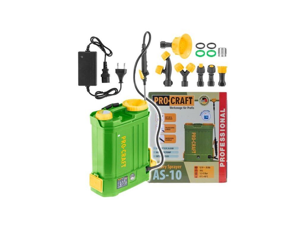 Akumulátorový postrekovač Procraft AS-10Akumulátorový postrekovač Procraft AS-10 je určený na postrekovanie, rozprašovanie prípravkov a prostriedkov, ošetrovanie rastlín a stromov, ničenie škodcov a buriny, dezinfekciu a čistenie priestorov. Po vyprázdnení nádoby dôjde k automatickému vypnutiu. Spoľahlivé čerpadlo s nastaviteľným prietokom a tlakom do 5 barov a integrovanou barometrickou reguláciou. Vrátane nabíjačky a batérie bezpečne uloženej vo vnútri stroja v puzdre odolnom voči vlhkosti. Prevádzkový čas až 8 h v závislosti od intenzity práce a pracovného tlaku. Postrekovač má teleskopickú kovovú trubicu a je vyrobený z vysokokvalitných materiálov, ktoré pod tlakom nepraskajú. Je vybavený gumovým tesnením, ktoré má väčšiu odolnosť ako štandardné silikónové tesnenie. Súčasťou balenia sú náhradné vymeniteľné trysky, trysky pre rôzne vzory postreku, praktický chrbtový popruh, tesniace krúžky a pohodlná spúšť pištole. Nádoba na postrek je priesvitná, takže počas práce vidíte objem kvapaliny. Kartónové balenie.
