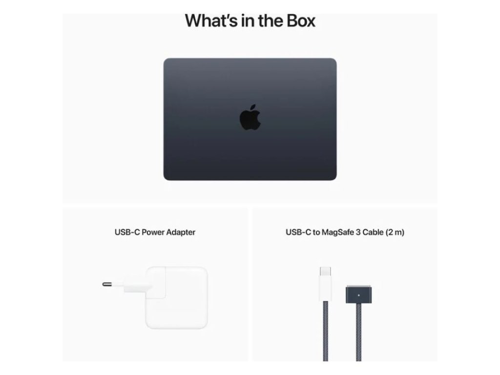 Balenie: 35 W duálny USB-C napájací adaptér, USB-C na MagSafe 3 nabíjací kábel 2 m, MacBook Air