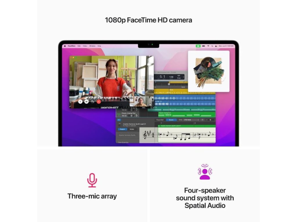 Predinštalované Aplikácie: App Store, Knihy, Kalendár, Kontakty, FaceTime, Nájsť, Freeform, GarageBand, Domácnosť, iMovie, Keynote, Mail, Mapy, Správy, Hudba, Poznámky, Numbers, Pages, Photo Booth, Fotky, Podcasty, Náhľad, QuickTime Player, Pripomienky, Safari, Skratky, Akcie, Time Machine, Apple TV, Diktafón