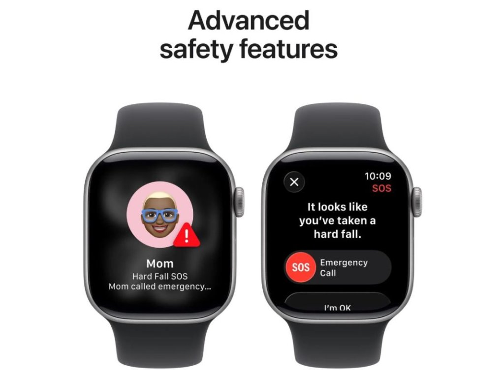 Ovládanie a bezpečnosť: Digital Crown s haptickou odozvou, bočné tlačidlo, gestá, medzinárodné tiesňové volania, detekcia pádu a autonehody