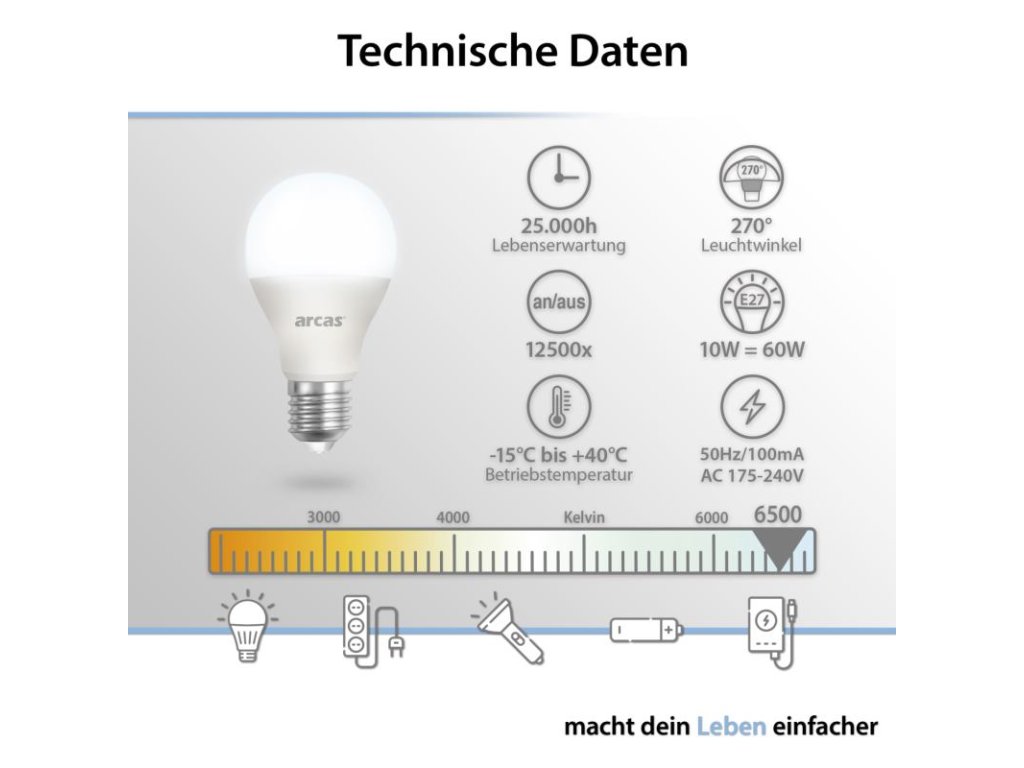 ARCAS LED žiarovka E27/10W/6500K/931lm