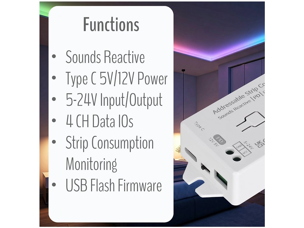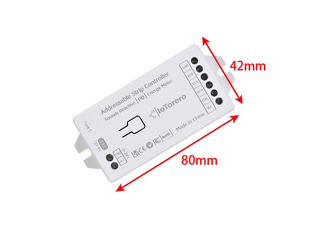 Vybavené manuálnym prepínačom napätia pre kompatibilitu s 5V alebo 12V LED pásikmi. Nastavte prepínač podľa špecifikácie vášho pásika a pripojte pomocou USB-C PD adaptéra.