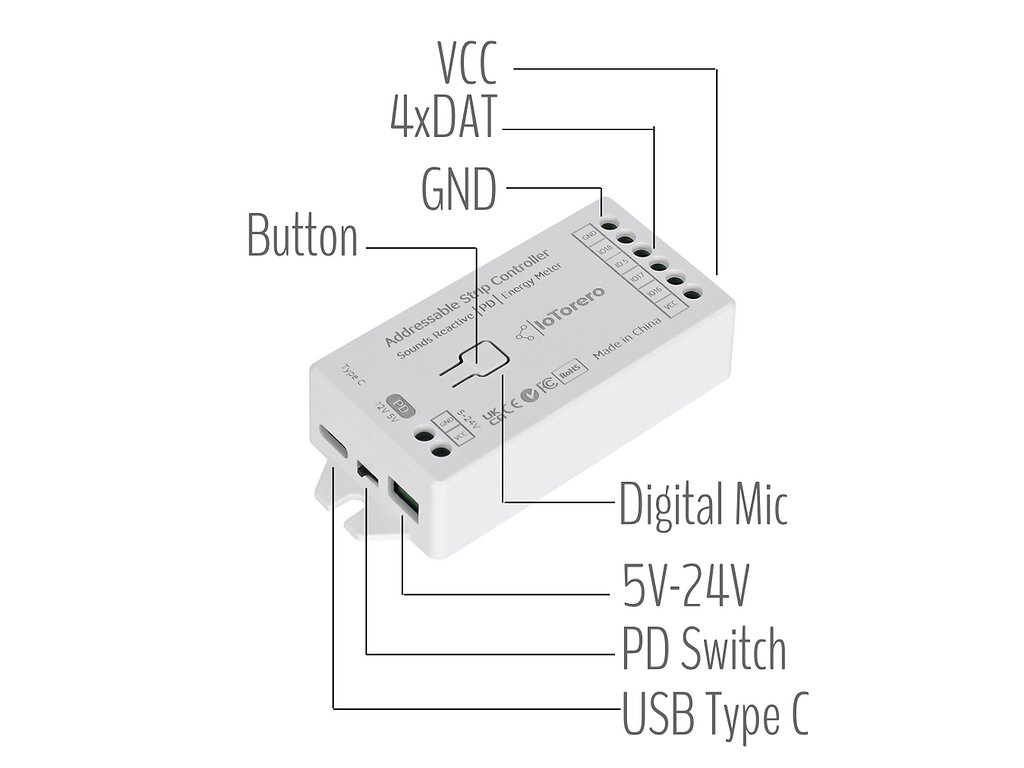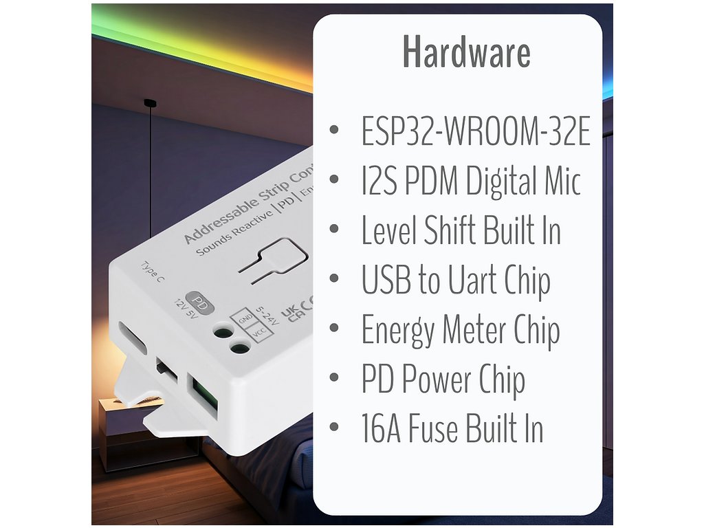 Profesionálny ovládač adresovateľných LED pásikov s integrovanými funkciami merania energie a zvukovou reaktivitou. Zariadenie je navrhnuté pre náročných používateľov a vývojárov, ktorí potrebují presné monitorovanie spotreby energie a pokročilé možnosti ovládania LED pásikov.