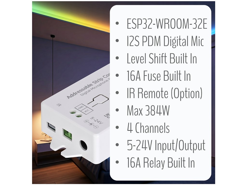 Pokročilý kontrolér pre adresovateľné LED pásiky s pokročilými funkciami zvukovej reaktivity, vyšším výkonom a integrovanými bezpečnostnými prvkami. Ideálny pre domáce osvetlenie, zábavné priestory a profesionálne inštalácie.