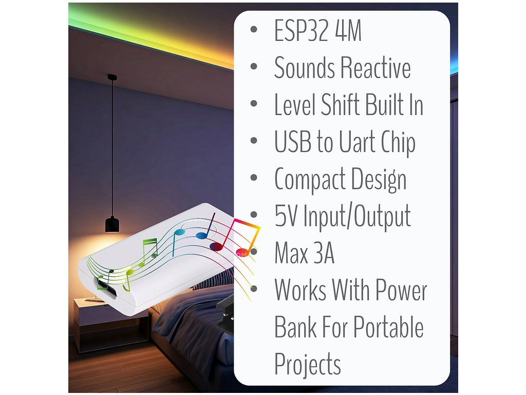 Zabudovaný vysoko citlivý I2S PDM digitálny mikrofón umožňuje dynamické svetelné efekty reagujúce na hudbu. Synchronizujte vaše adresovateľné LED pásky so zvukom pre úchvatný svetelný zážitok.