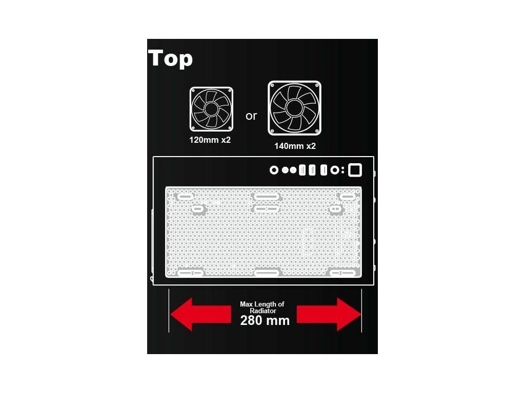 Ventilátory (horné): 3x 120 mm (voliteľné) alebo 2x 140 mm (voliteľné)