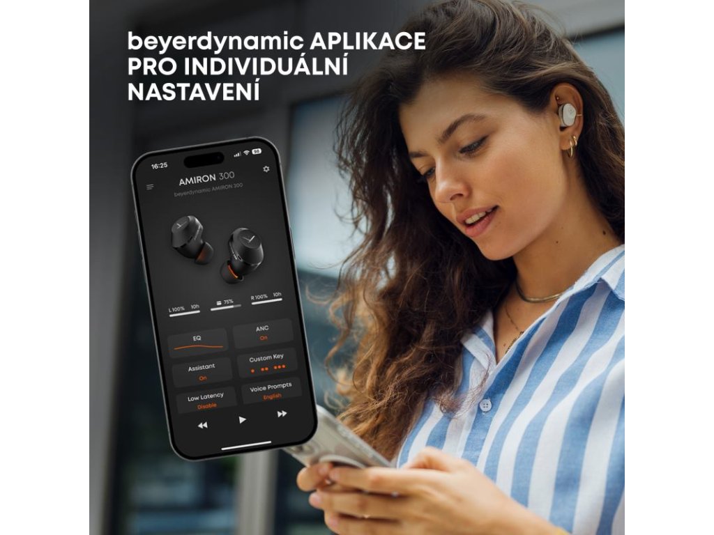 Stiahnite si aplikáciu beyerdynamic a staňte sa pánom svojho zvuku. Upravte si basy, zvýraznite výšky a vytvorte si vlastný zvukový profil pomocou 5-pásmového ekvalizéra. AMIRON 300 sa prispôsobia vám, nie naopak.