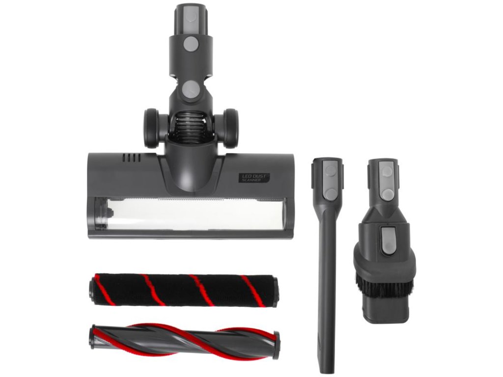 - LED DUST SCANNER elektrická kefa na tvrdé podlahy, šírka 23 cm, so systémom zberu srsti a chlpov z kefového valčeka, vybavená gumovými kolieskami na ochranu podlahy