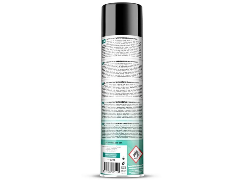 CLEAN IT antistatická čistiaca pena je špeciálne navrhnutá na bezpečné a účinné čistenie obrazoviek. S objemom 400 ml táto čistiaca pena odstraňuje prach, odtlačky prstov a iné nečistoty bez poškodenia povrchu zariadení. Jej antistatické vlastnosti pomáhajú predchádzať usadzovaniu prachu po čistení. Je ideálna na použitie na LCD, LED a plazmových obrazovkách, ako aj na monitoroch, notebookoch a tabletoch.