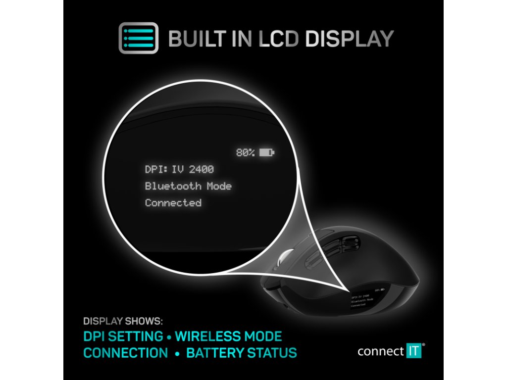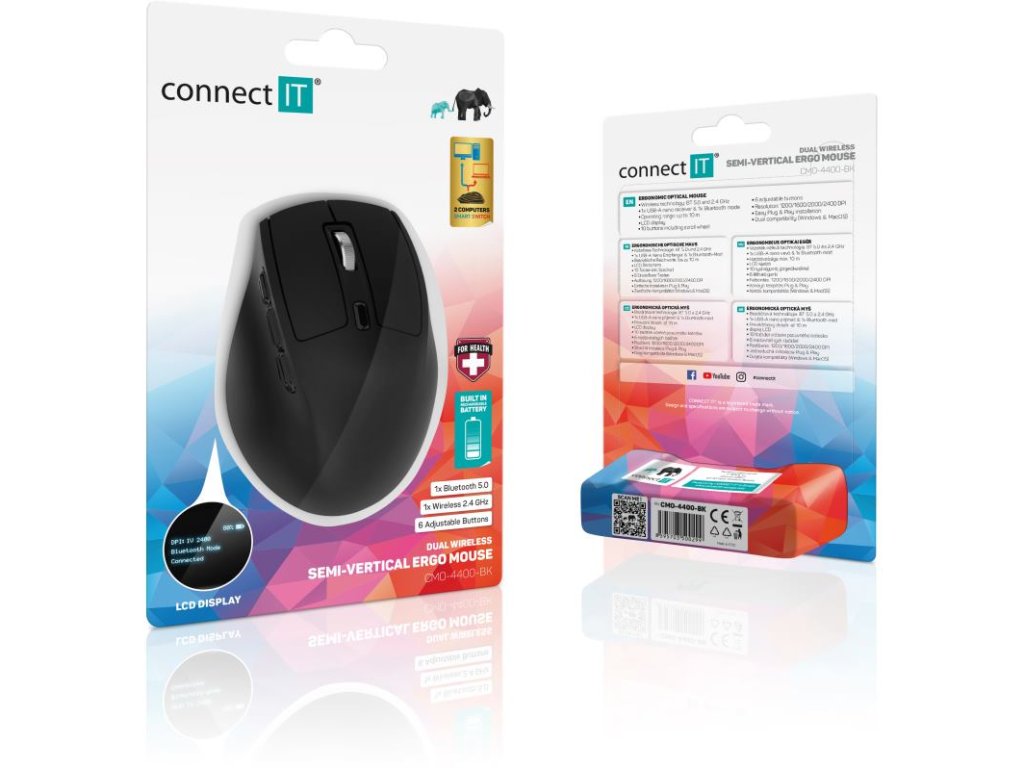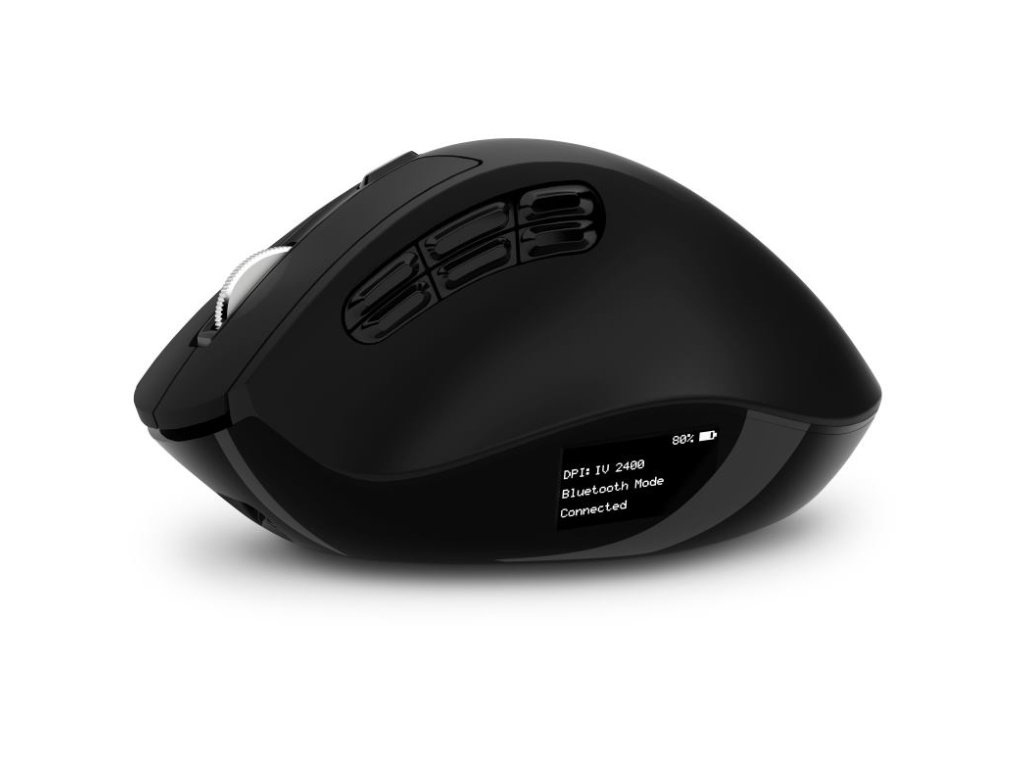 Semi-vertikálna ergonomická optická bezdrôtová myš FOR HEALTH Semi-Verti DualMode s LCD displejom BLACK je špecificky navrhnutá ako prevencia proti syndrómu karpálneho tunela. Ponúka možnosť pripojenia na dva počítače vďaka technológii DualMode (Bluetooth 5.0 + 2,4 GHz wireless). DPI rozlíšenie až 2400 DPI. 10 tlačidiel vrátane precízneho otočného kolieska. Samozrejmosťou je USB Nano prijímač a dodávaný nabíjací kábel.