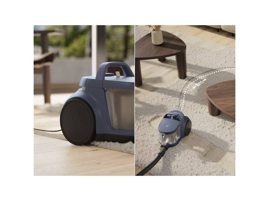 Objavte vysávač, ktorý bol navrhnutý s ohľadom na maximálne pohodlie a efektívnosť. Vďaka kompaktnej konštrukcii, veľkorysému 8-metrovému akčnému rádiusu a ergonomickému dizajnu je upratovanie s ním skutočne jednoduché. Veľké mäkké kolieska zaisťujú plynulý pohyb po miestnosti a zároveň chránia vaše podlahy pred poškriabaním.