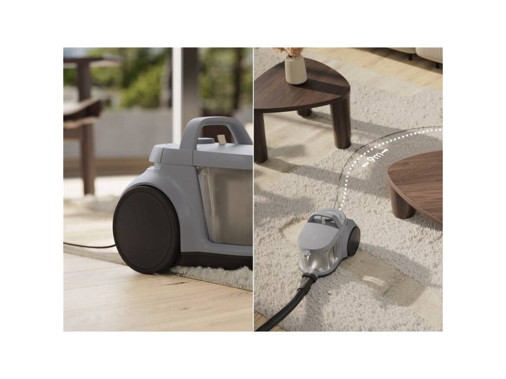 Ergonómia a kompaktnosť: Vysávač je navrhnutý pre maximálne pohodlie. Veľké mäkké kolieska, akčný rádius 9 metrov a kompaktné rozmery uľahčujú manipuláciu aj následné uskladnenie vo vertikálnej či horizontálnej polohe.