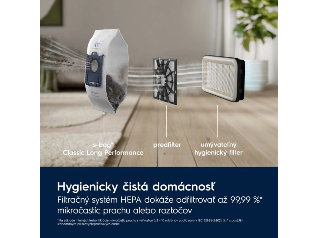 Účinnosť filtrácie, kompletný vysávač (%). Norma: EN 60312-21-2017: 99.99