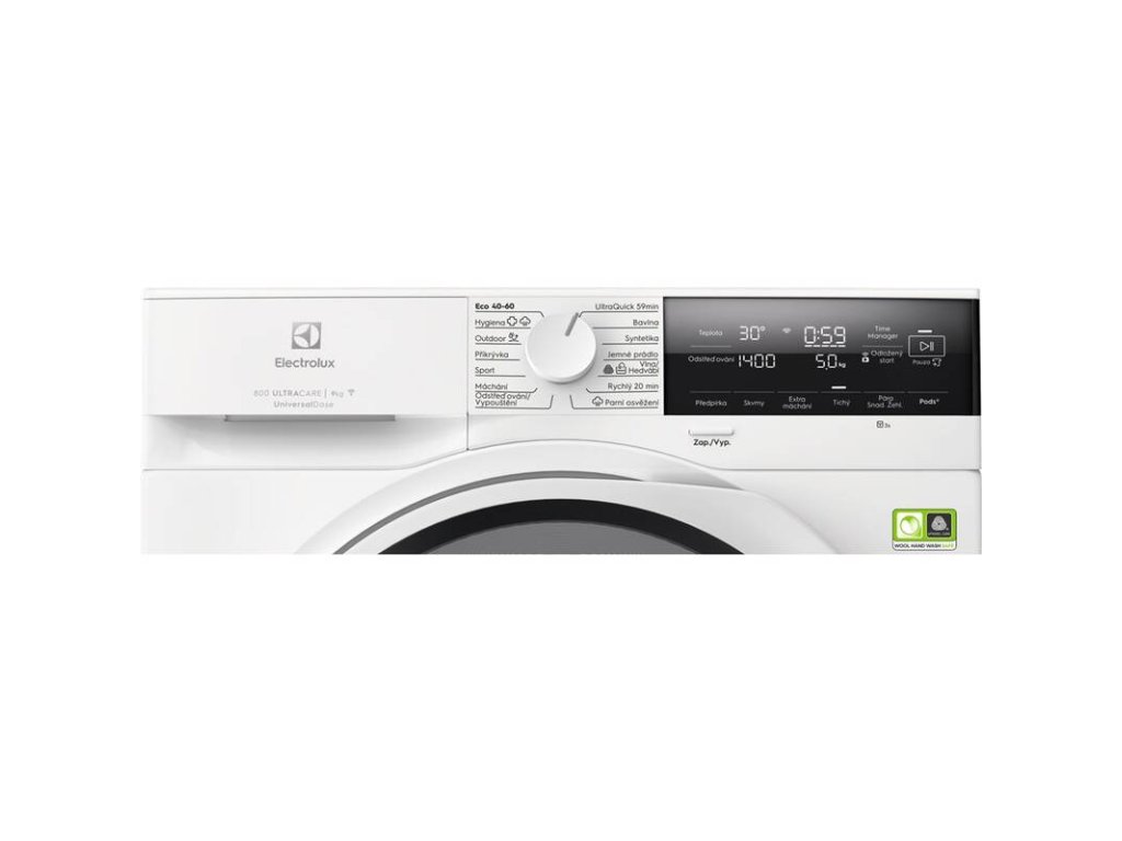 Pracie programy: Ultraquick 59Min, bavlna, syntetika, jemná bielizeň, wool\silk, Rapid 20 Min, para osvieženie, odstredenie/vypustenie, plákanie, Sportwear, Duvet, športová bielizeň, Hygiene, Eco 40-60
