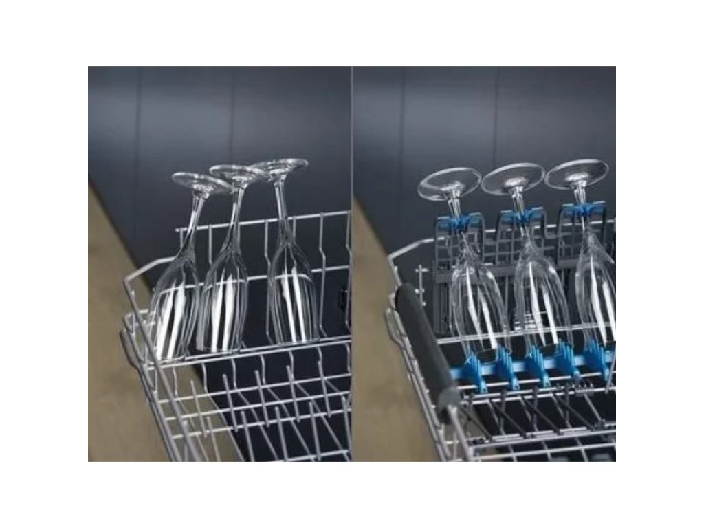 Vlastnosti horného koša: 6 úchytov na poháre na víno, 2 sklopné držiaky, 2 sklopné drôtené úchyty na poháre, 2 mäkké gumové špičky , sklopné držiaky na poháre, plastová rukoväť Electrolux