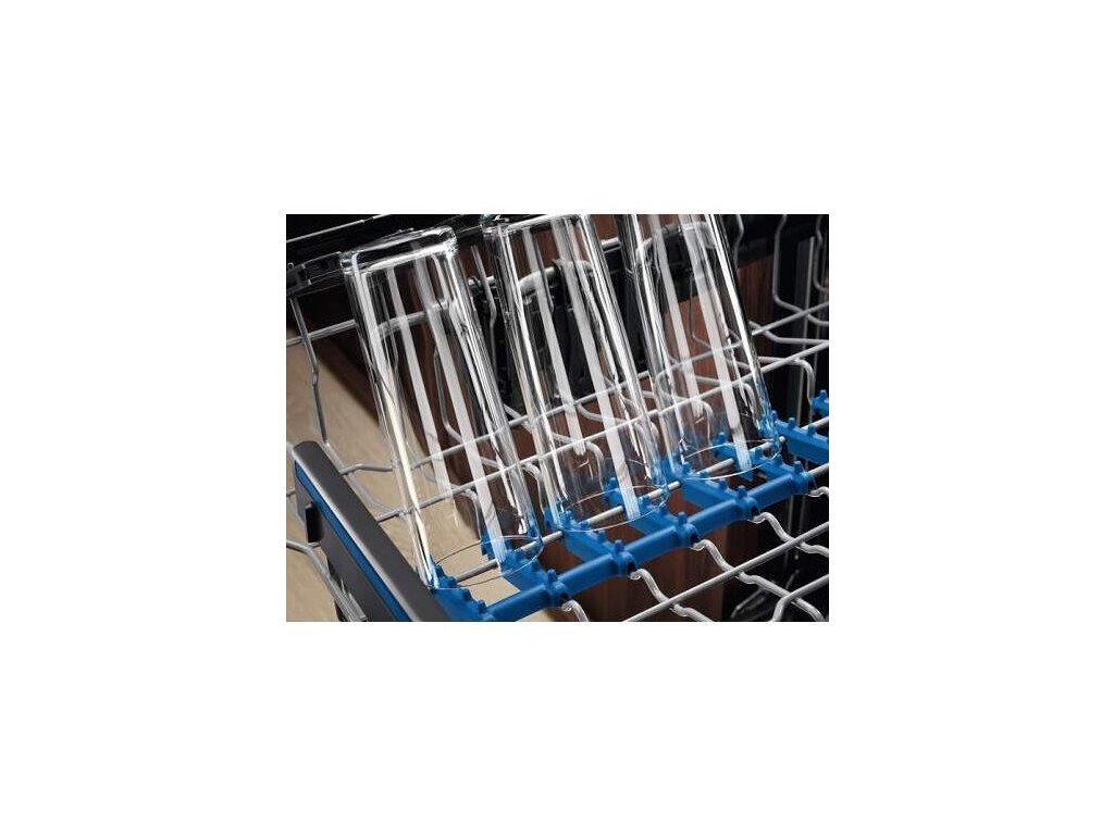 Horný košík s: 2 modré mäkké pogumované hroty na pridržiavanie skla, sklopné držiaky na poháre, plastová farebná rukoväť