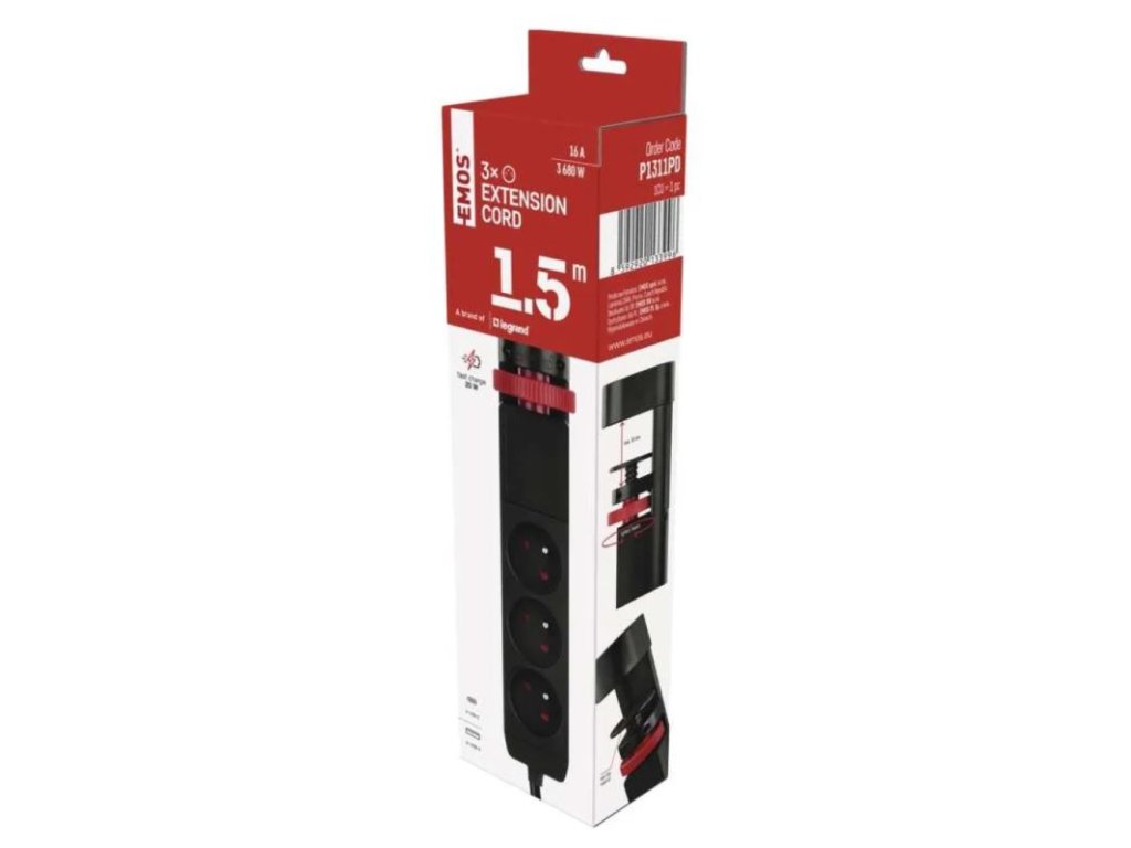 EMOS Predlžovačka s držiakom, 1,5m, 3x FR, čierna