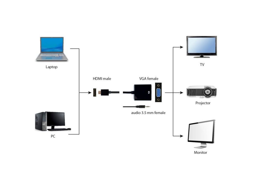 Jednoduché prepojenie: Umožňuje pripojiť HDMI zariadenie k VGA monitoru alebo projektoru.