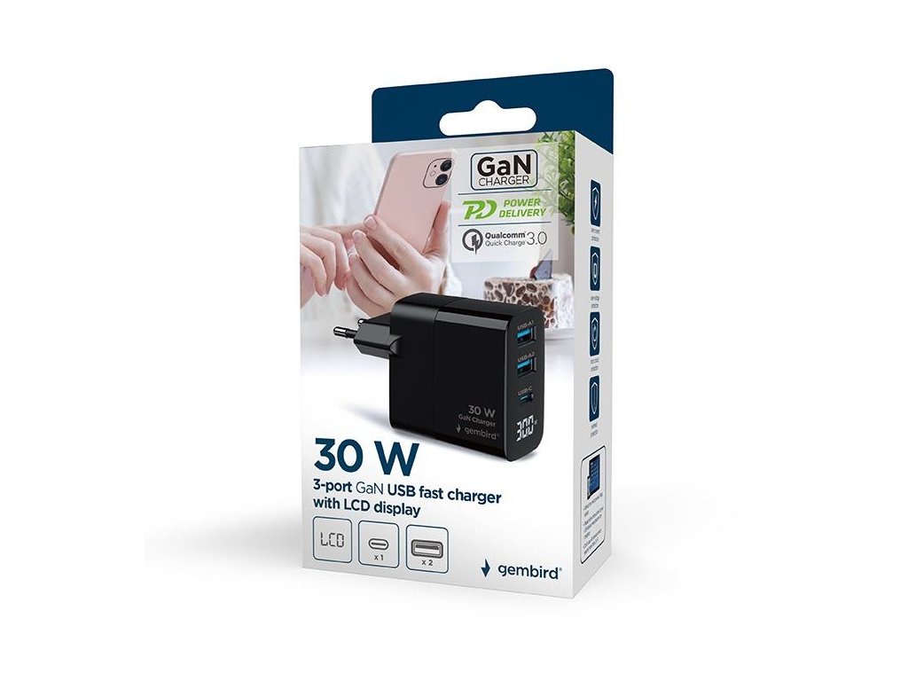 GEMBIRD Nabíjačka, 2x USB/USB-C, 30W, čierna