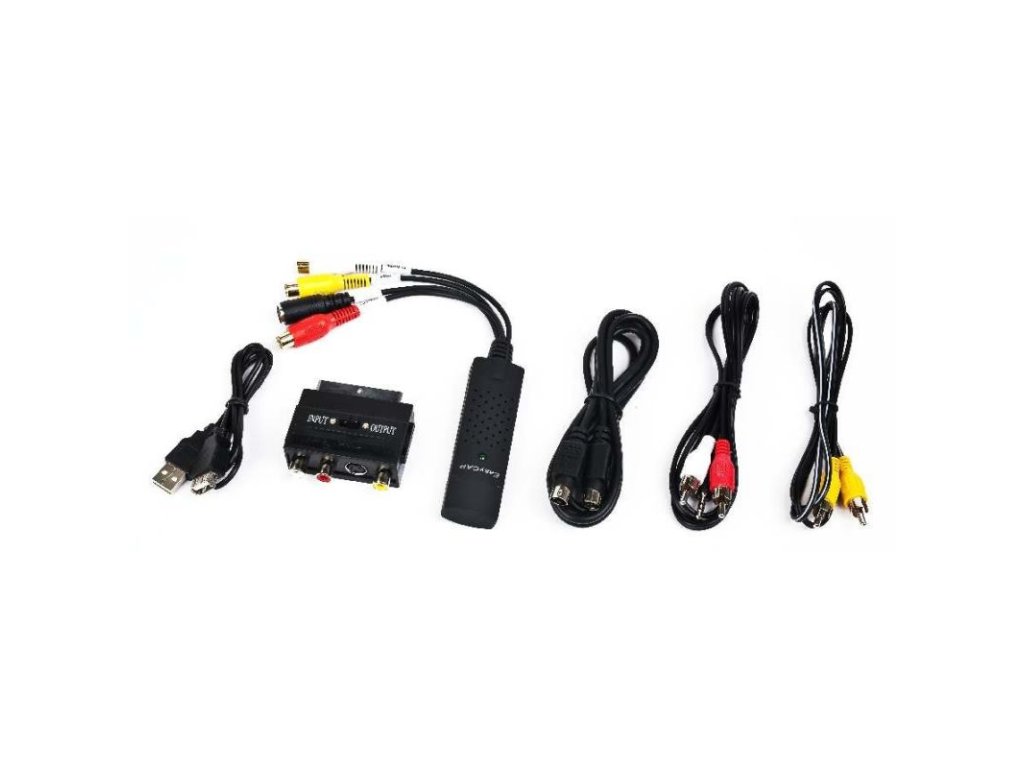 Vstupy: kompozitný RCA, S-Video, stereo RCA audio, SCART (cez priložený adaptér)