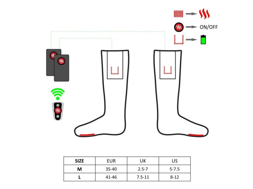 Ponožky sú napájané prostredníctvom ľubovoľnej powerbanky (dve sú súčasťou balenia), ktoré sa vkladajú do bočného vrecka. Priložené batérie zaručujú dobu vyhrievania až 6 hodín. Použitím vlastnej powerbanky s väčšou kapacitou navyše môžete tento čas až niekoľkonásobne predĺžiť. Intenzitu vyhrievania (3 stupne) jednoducho zvolíte priloženým diaľkovým ovládačom, pomocou ktorého možno samozrejme výhrev aj zapínať či vypínať.