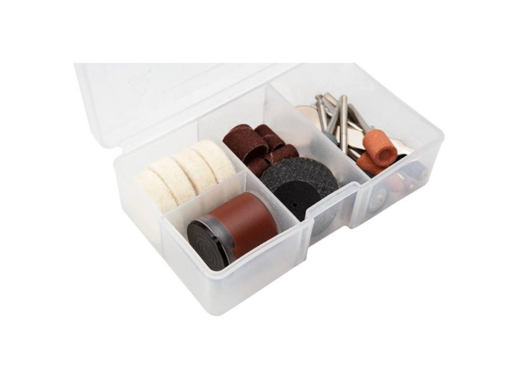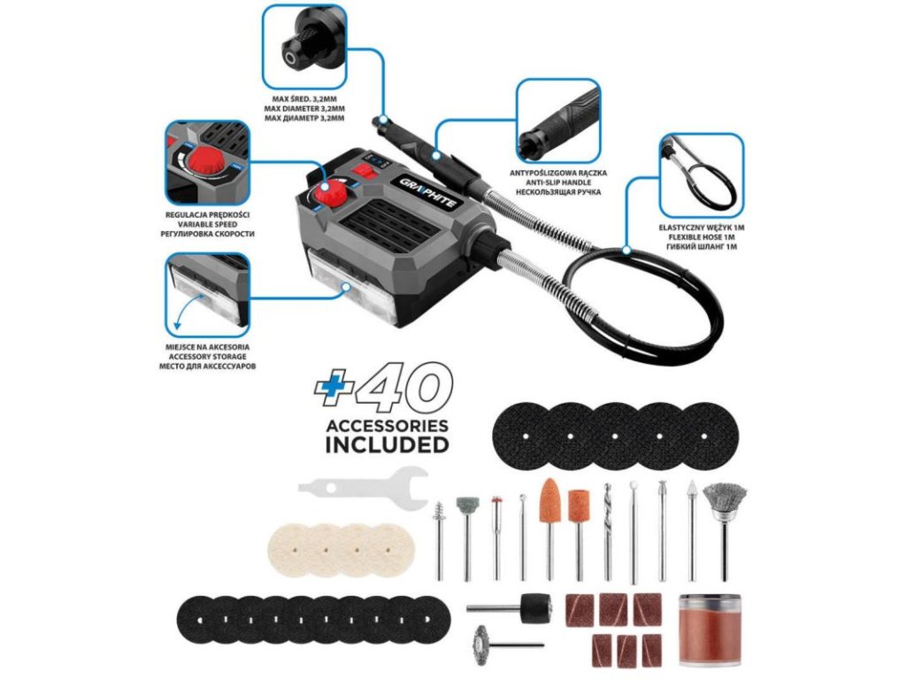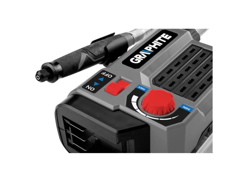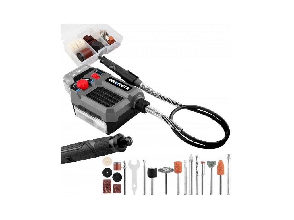 Akumulátorová minibrúska Energy+ 18 V bez akumulátora 58GE107 od spoločnosti GRAPHITE je náradie určené na rôzne presné dokončovacie práce: brúsenie, rezanie, gravírovanie, odstraňovanie prachu, frézovanie - aj na ťažko prístupných miestach. Funguje na základe dobíjacieho systému Energy+ a 18V lítium-iónovej batérie. Prevádzkový čas 2Ah batérie je 49 minút. Odporúčaná batéria je 4 Ah. Nástroj má variabilnú reguláciu otáčok (5000 - 33000/min). Má zásuvku na príslušenstvo, gumové podložky na stabilizáciu nástroja, ktoré tlmia nárazy, a protišmykovú rukoväť. Priemer vretena minibrúsky a priemer rukoväte je 3,2 mm. Ohybný hriadeľ je dlhý 1 m. Súprava obsahuje 40 kusov príslušenstva: 5x rezný kotúč, 10x brúsny papier, 3x brúsny kotúč so skľučovadlom 3,2 mm, 2x brúsna stopka, 6x brúsny pás, 1x vrták, 3x diamantové vrtáky 3,2 mm, 2x tŕň 3,2 mm, 4x plstený kotúč, 1x oceľová drôtená kefa 3,2 mm, 1x kľúč, 1x leštiaca hmota, 1x fréza Hss 3,2 mm. Toto je dokonalý nástroj značky GRAPHITE na úlohy pre domácich majstrov.