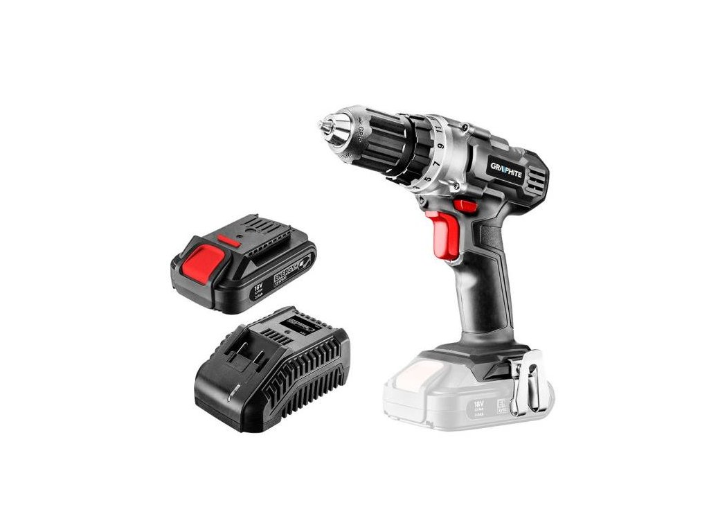 Dvojrýchlostný vŕtací skrutkovač GRAPHITE, spolupracuje s akumulátormi 18 V Li-Ion GRAPHITE Energy+. Elektrické náradie má plynulú reguláciu rýchlosti otáčania a bolo vybavené prepínačom smeru otáčania. Samoupevňovacie skľučovadlo umožňuje používanie príslušenstva s priemerom 0,8-10 mm. Maximálna rýchlosť otáčania vretena na prvej rýchlosti je 350 a na druhej 1250 otáčok za minútu.