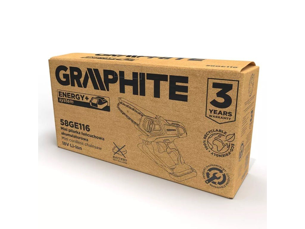 Mini akumulátorová reťazová píla značky GRAPHITE. Náradie je kompatibilné s 18 V lítium-iónovými batériami systému Energy+. Píla je vybavená 12 cm dlhou reťazou , ktorá zaisťuje maximálny rez 10 cm. Zariadenie sa odporúča na prácu v záhrade a na strihanie a orezávanie konárov stromov alebo kríkov. Vďaka svojim kompaktným rozmerom vám umožní dosiahnuť aj na ťažšie dostupné miesta.