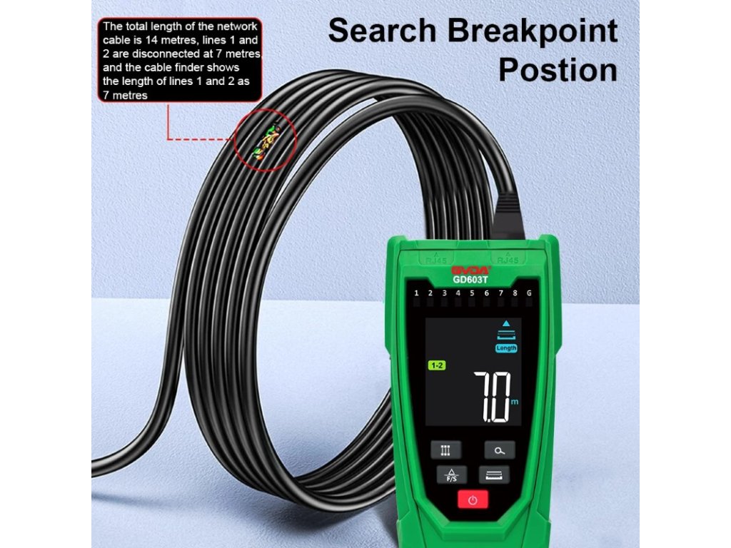Detekcia prerušenia káblov: Umožňuje rýchlo identifikovať miesta, kde je kábel poškodený alebo prerušený.