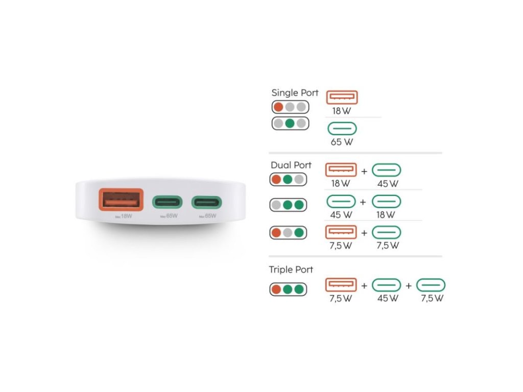 Vysoký výkon 65 W: Dostatočný výkon pre napájanie moderných notebookov s USB-C (napr. MacBook, Dell, HP), tabletov a rýchle nabíjanie najnovších smartfónov.