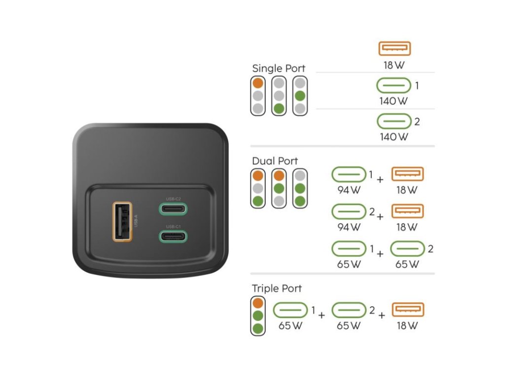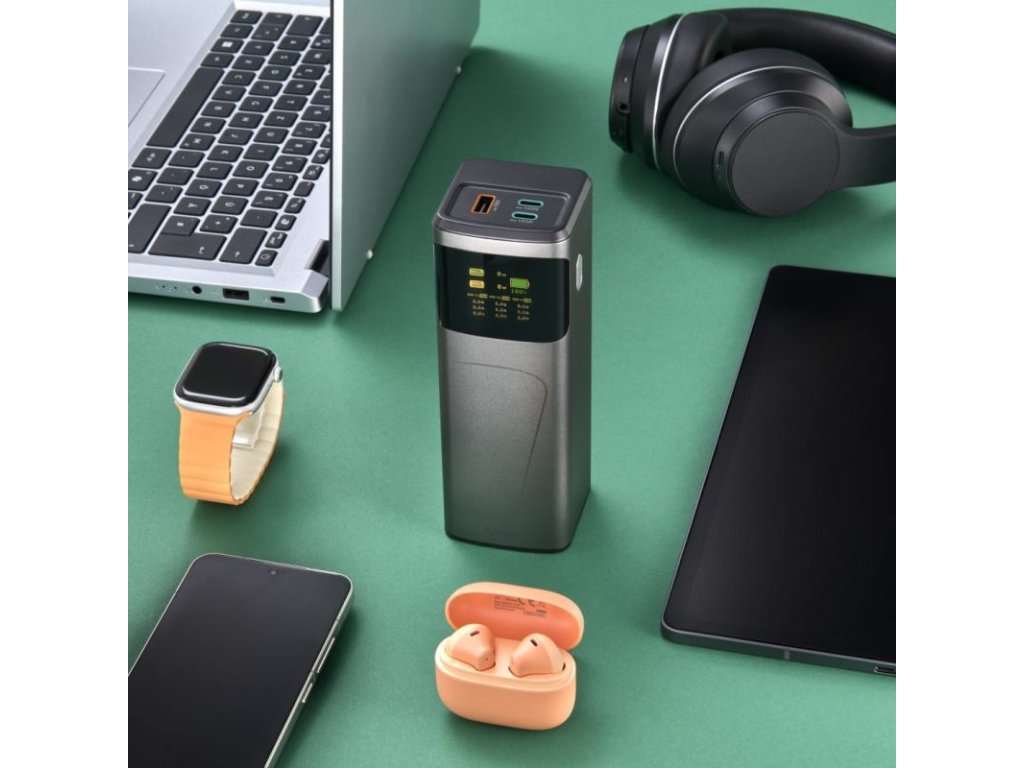 Powerbanka inteligentne riadi výkon. Pri pripojení dvoch zariadení do oboch USB-C zásuviek bude výkon každej z nich 65 W. Pri obsadení všetkých troch portov bude výkon rozdelený na 65 W (USB-C), 65 W (USB-C) a 18 W (USB-A).