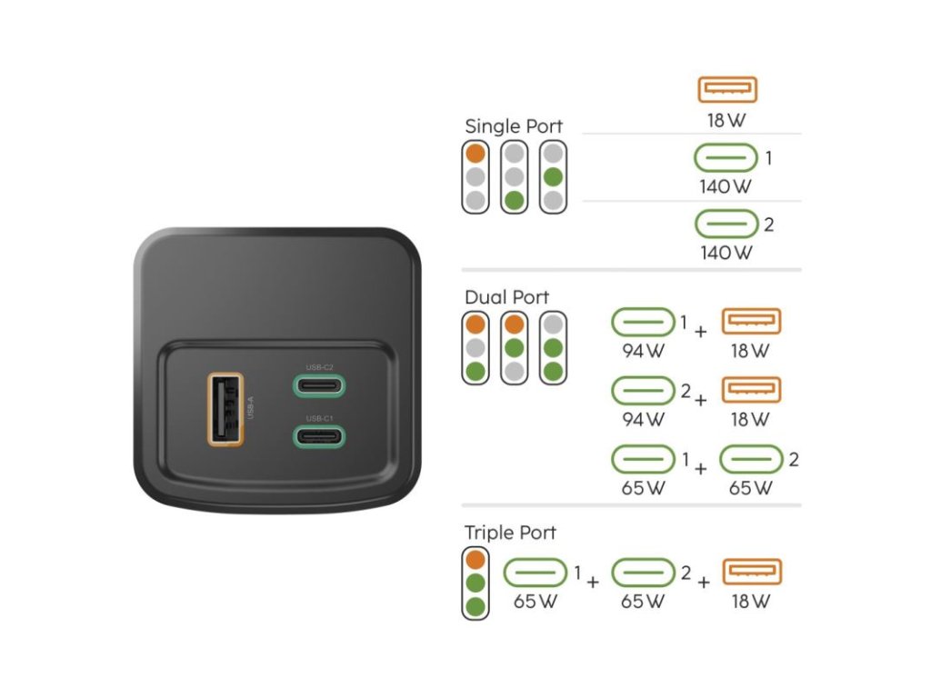 Výstup 1 (USB-C): 5-20V/4,7A, EPR 28V/5A (max. 140 W)