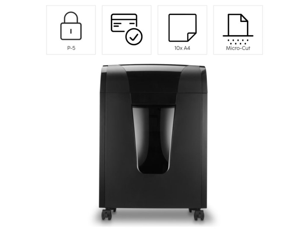 Tento model dokáže naraz skartovať až 10 listov papiera formátu A4 (80 g/m2), ktoré premení na drobné častice s rozmermi len 2 x 12 mm. Takto malé kúsky nielenže znemožňujú rekonštrukciu dokumentov, ale taktiež maximalizujú kapacitu 20-litrového zberného koša. Vysoko kvalitné oceľové nože si bez problémov poradia aj so zošívacími sponkami, takže nemusíte strácať čas ich odstraňovaním. Okrem papiera skartovačka bezpečne zničí aj plastové karty s čipom alebo magnetickým prúžkom.