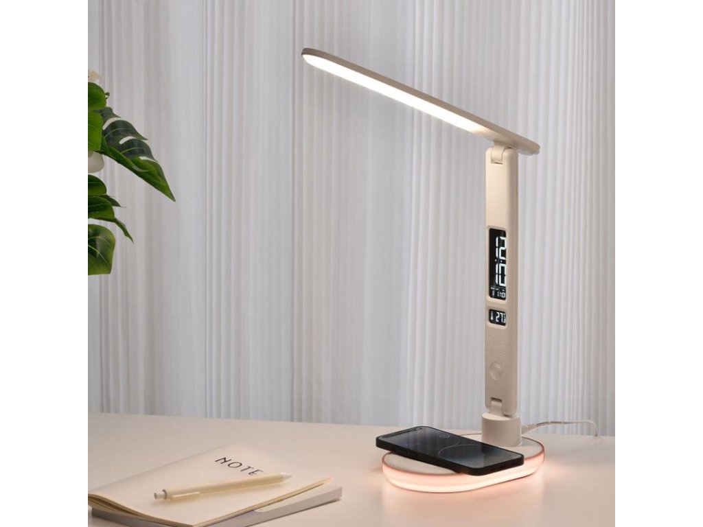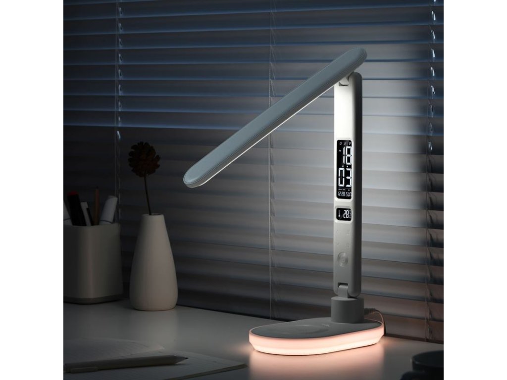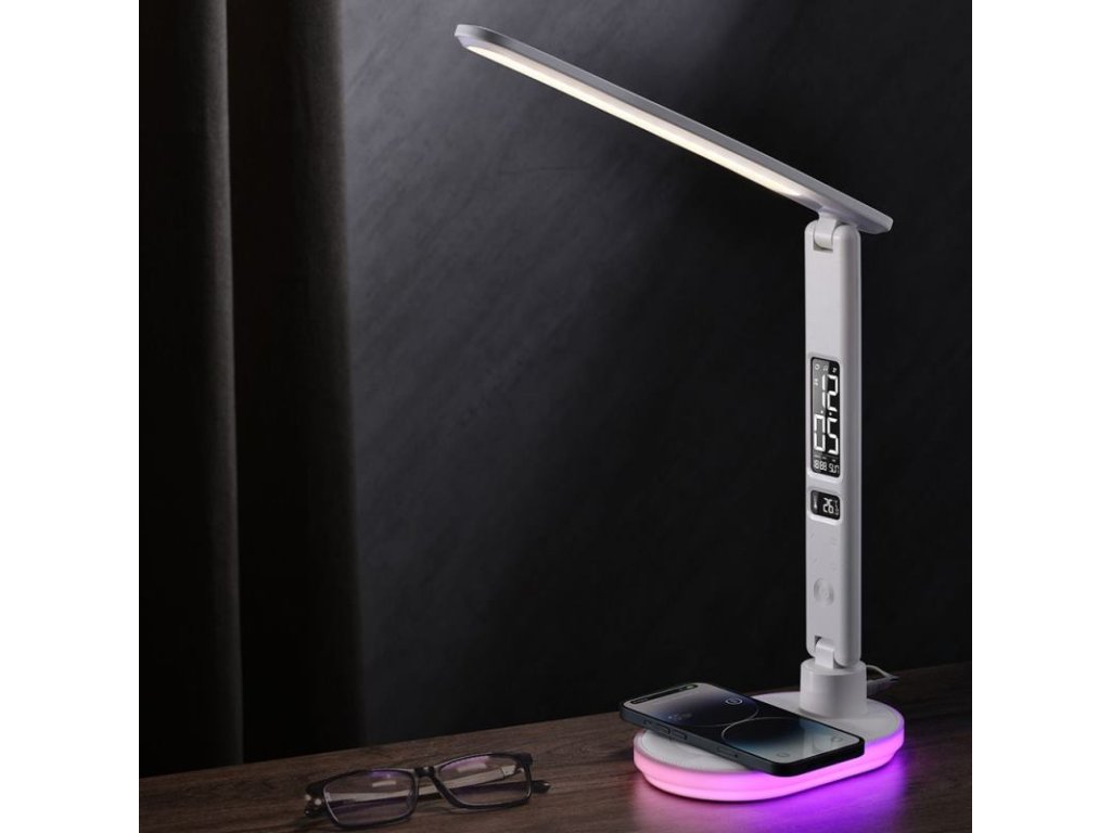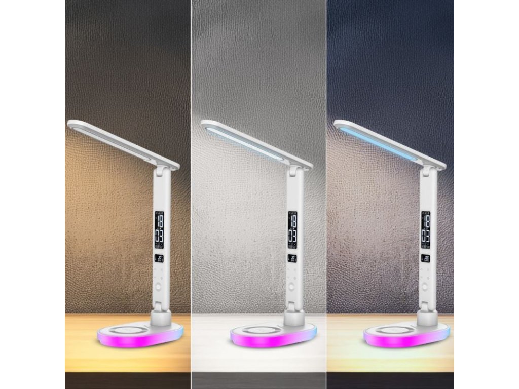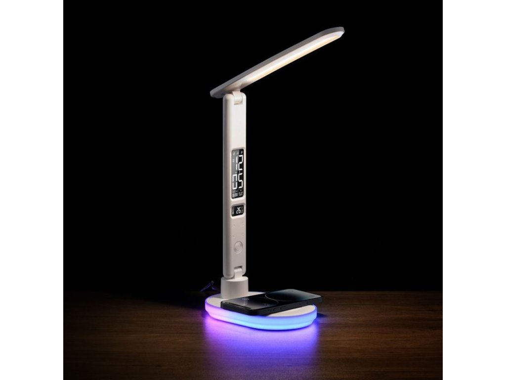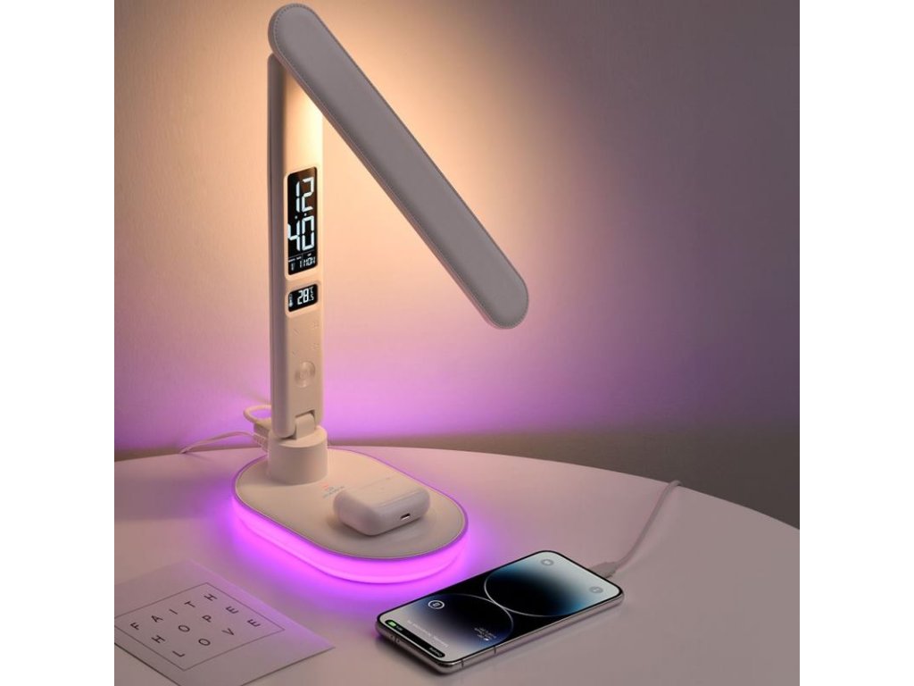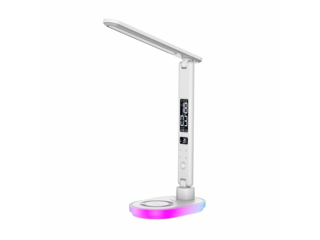 HAWK HW-LAMP03 je moderná LED lampička, ktorá v sebe spája praktické osvetľovacie funkcie a inovatívne technologické riešenia. Vďaka 3 druhom farebnej teploty, dotykovej regulácii jasu a vstavanému RGB svetlu v základni sa výborne hodí ako stolná lampička i nočné svetlo. Navyše displej s funkciou budíka a bezdrôtové nabíjanie z nej robia všestranný doplnok do každého interiéru.