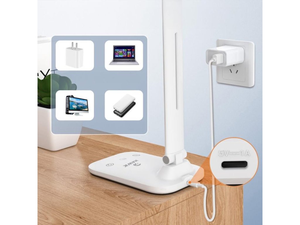 LED lampička HAWK HW-LAMP01 je vybavená portom USB-C, ktorý zabezpečuje pohodlné a rýchle pripojenie k rôznym zdrojom napájania, ako laptop, powerbank či klasická sieťová zásuvka. Vďaka tomu môžete používať lampičku na ľubovoľnom mieste, bez potreby tradičnej zásuvky v blízkosti. Navyše, v balení sa nachádza určený napájací adaptér, čo umožňuje okamžité začatie používania bez potreby dokúpenia dodatočného príslušenstva.