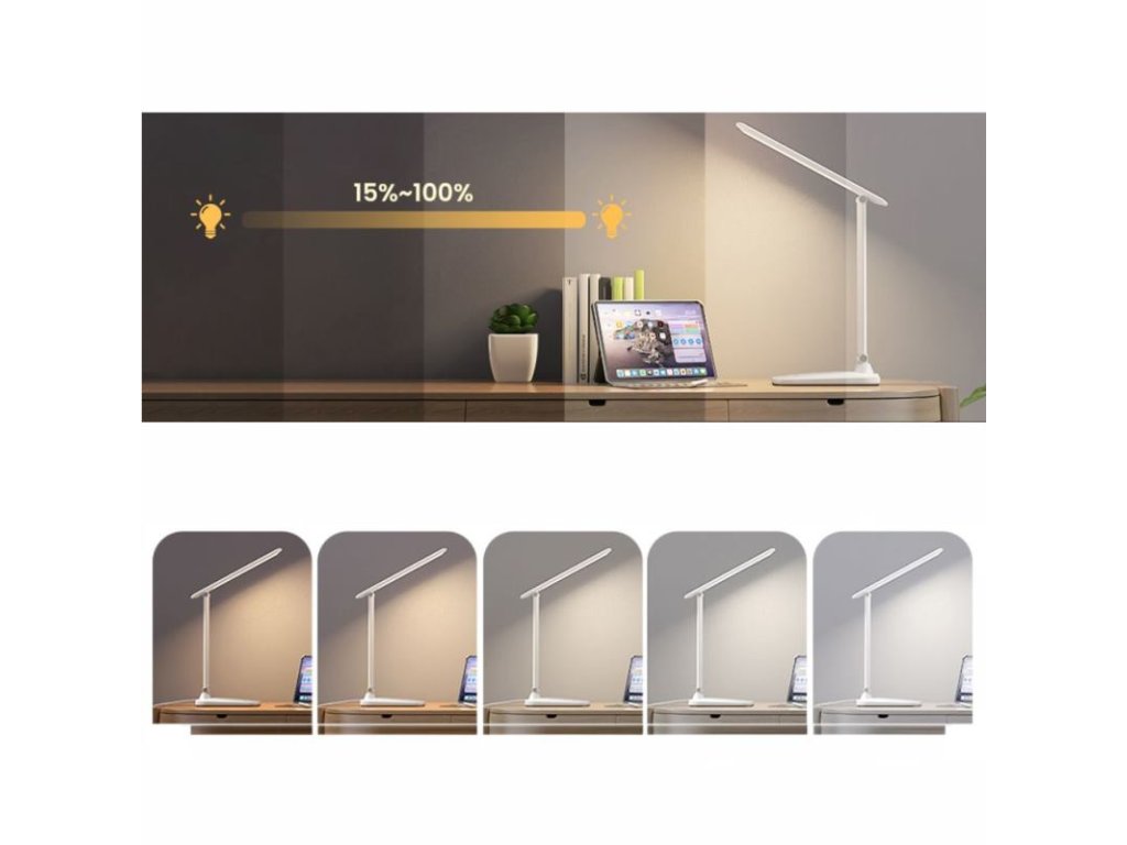 Lampička je vybavená skladacím ramenom, ktoré umožňuje nastavenie uhla svietenia v rozsahu 100° pri základni a 180° pri hlavici. Vďaka tomu môžete presne nasmerovať svetlo tam, kde je potrebné - či už na stôl, knihu, alebo pracovné miesto pri počítači.