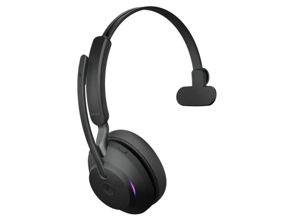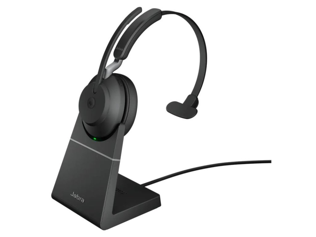 Obsah balenia: Náhlavná súprava, stolový nabíjací stojan (podľa variantu), adaptér Jabra Link 380 BT, kábel USB-C na USB-A (1,2 m), mäkké puzdro, záručný list a bezpečnostné pokyny.