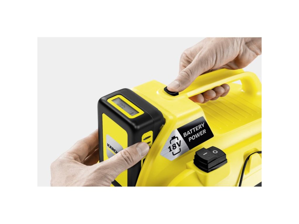 Umožňuje pracovať bez potreby napájania a tým dosiahnuť maximálnu voľnosť pohybu Technológia v reálnom čase s LCD displejom batérie: zostávajúci čas prevádzky, zostávajúci čas nabíjania a kapacita batérie. Kompatibilný so všetkými strojmi zo systému 18 V vymeniteľných batérií Kärcher Battery Power.