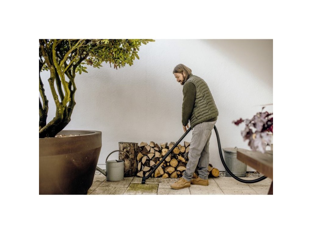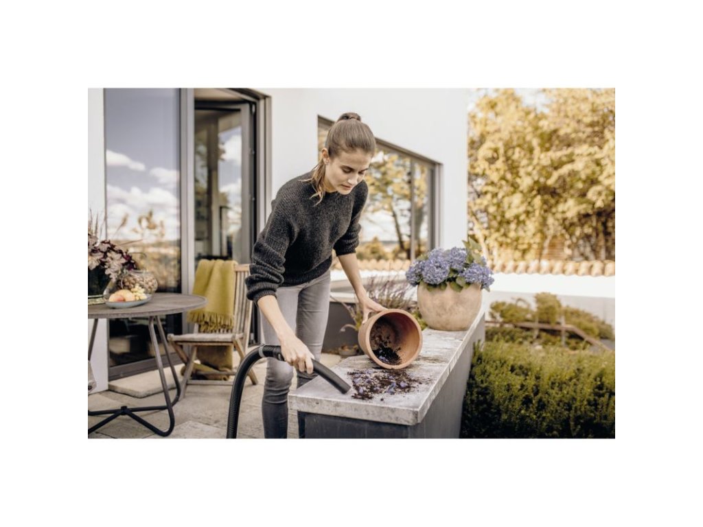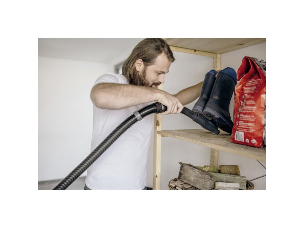 Hadica sa ukladá zavesením na hlavu stroja, čím sa šetrí miesto. Kábel je možné uložiť na hák na kábel, trubice a podlahové hubice na nárazníku. Uzamykací systém "Pull & Push" umožňuje jednoduché otváranie a zatváranie nádoby. Rukoväť vysávača je možné odstrániť a príslušenstvo pripojiť priamo k sacej hadici. Tiež šikovné: Nástroje alebo malé diely je možné položiť na plochu hlavy stroja. Ergonomicky tvarovaná rukoväť na prenášanie umožňuje pohodlnú prepravu.