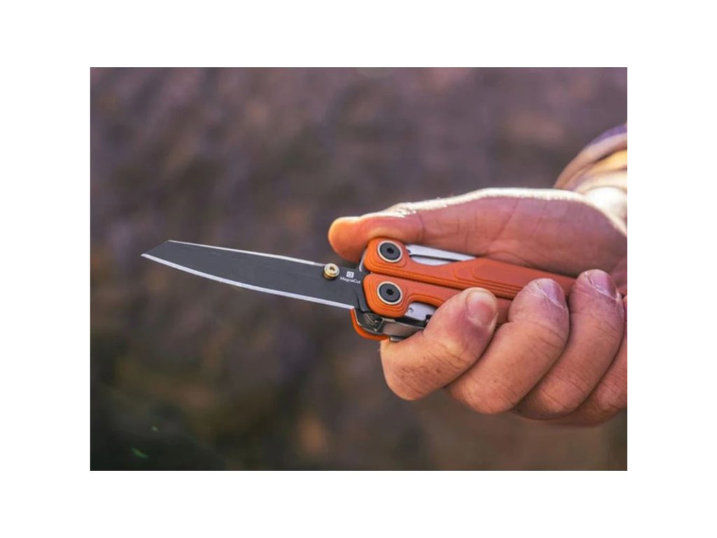 Vylepšená ergonómia: Nový dizajn črienok a profil čepele minimalizujú miesta, kde by mohlo dôjsť k pricviknutiu prstov, a zvyšujú pohodlie pri nosení a používaní. Kolík na čepeli uľahčuje otváranie noža, zatiaľ čo otvory pomáhajú pri vysúvaní pílky a pilníka.