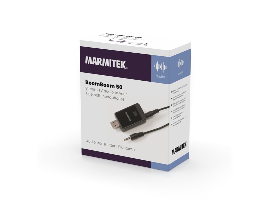 Bezdrôtovo prenášajte zvuk z televízora do vašich Bluetooth slúchadiel pomocou tohto šikovného Bluetooth vysielača. S BoomBoom 50 môžete jednoducho streamovať zvuk z televízora, ktorý sám osebe nemá Bluetooth, priamo do vašich bezdrôtových slúchadiel. Vychutnajte si večerný program alebo napínavý futbalový zápas bez toho, aby ste rušili okolie, alebo si konečne zreteľne vypočujte každý dialóg. Zariadenie je taktiež vhodné na prenos zvuku z vášho domáceho audio systému.